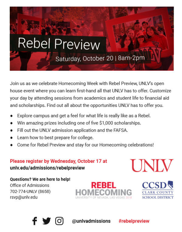 Join us as we celebrate Homecoming Week with Rebel Preview, UNLV’s open house event where you can learn first-hand all that UNLV has to offer. Please register by Wednesday, October 17 @ unlv.edu/admissions/virtual-rebel-previewunlv.edu/